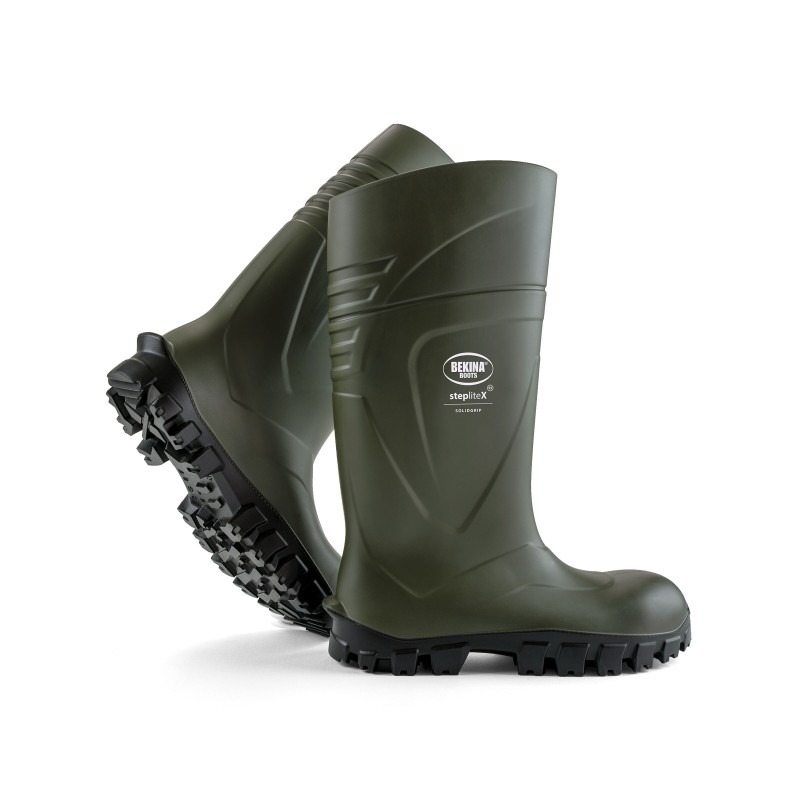 Tige en Néotane® : polyuréthane de grande qualité • Haut de tige profilé pour faciliter la marche en position pliée • Légères et souples même à basse température • Chaussant large et ergot de déchaussage • Embout en acier. Semelle extérieure crantée certifiée SRC : excellente adhérence sur sols humides, gras et secs • Crantage Solidgrip pour milieux difficiles et longévité accrue • Semelle anti-perforation en acier • Semelle intérieure Bekina Boots® : ergonomique, confortable et amovible • Isolation thermique jusqu’à -30°C. EN20345 : 2011 S5 SRC • Résistantes aux huiles, graisses, produits chimiques et fumier. Pointures du 36 au 48