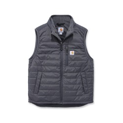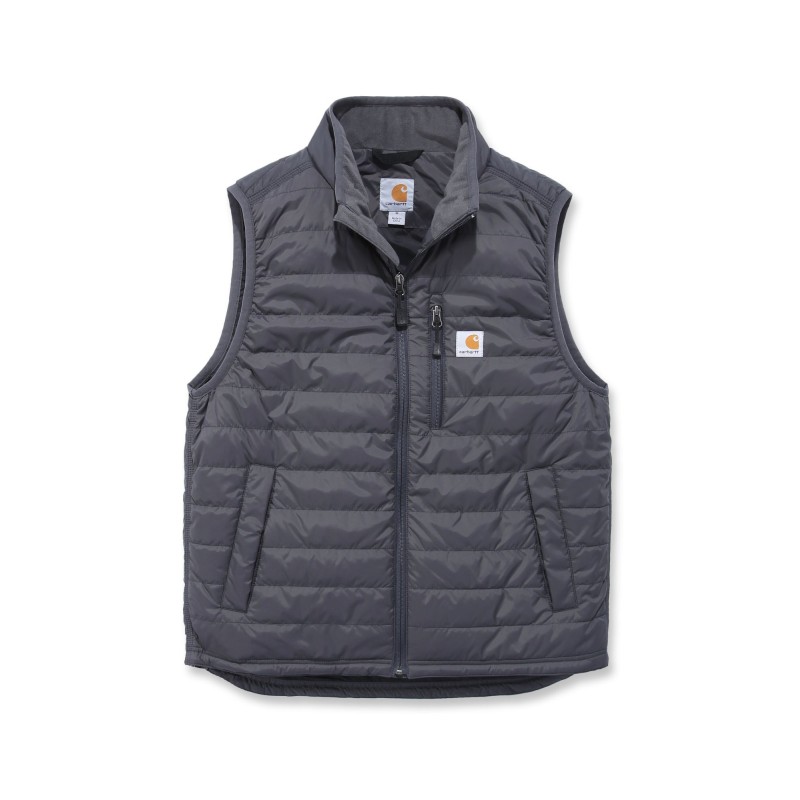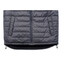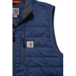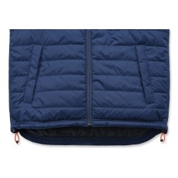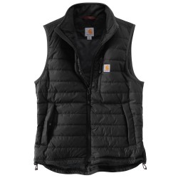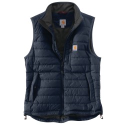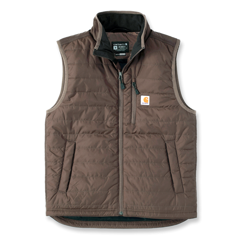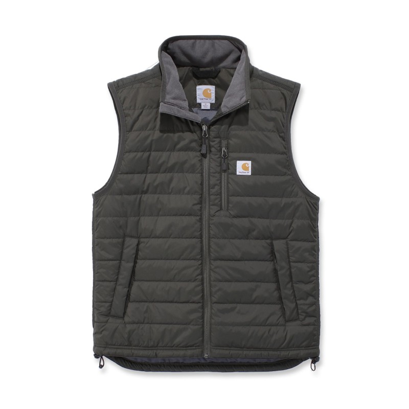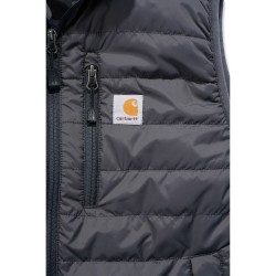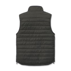 Gilet sans-manche matelassé déperlant • Col montant zippé • Poche poitrine gauche fermeture zip avec étiquette Carhartt® cousue • 2 poches avant fermeture boutons-pression • 2 poches intérieures : une à fermeture zip et une avec scratch • Réglage taille par lacet • Dos allongé • Coutures principales triples · Zip YKK® .