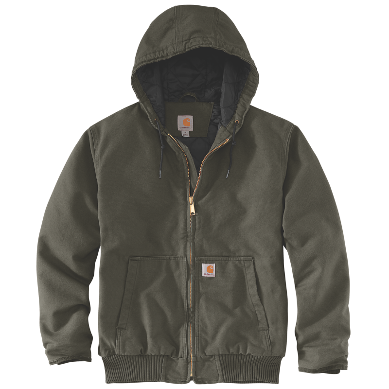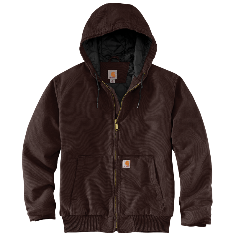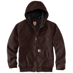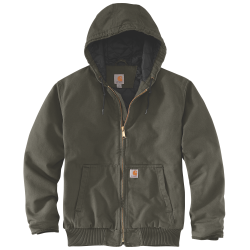 Blouson court à capuche en Cotton Duck brut • 2 grandes poches avant plaquées renforcées avec étiquette Carhartt® cousue côté gauche • 2 poches intérieures : une à fermeture zip et une avec scratch • Capuche à cordon de serrage réglable • Coudes préformés • Renfort Cordura® en bas des manches • Poignets et tour de taille bords côtes tricot • Fermeture éclair avant YKK® surdimensionnée laiton marquée Carhartt® • Coutures principales triples.