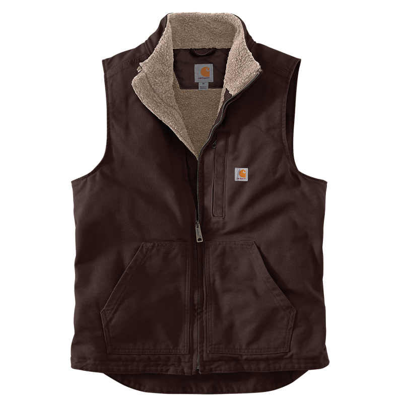 Gilet sans manche Cotton Duck · Col montant et dos doublés sherpa · Poche poitrine côté gauche avec fermeture zip · 2 grandes poches avant avec doublure sherpa et étiquette Carhartt® cousue côté gauche · 2 poches intérieures : une à fermeture zip et une avec scratch · Fermeture éclair centrale · Arrière allongé pour une meilleure protection du bas des reins · Avant court pour plus de confort en position assise · Coutures principales triples · Zip YKK® . Composition : Toile 100% coton lavé · Doublure sherpa.