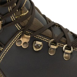 Semelle Vibram® à gros cramponnage · Tige tout cuir Dakar pleine fleur avec doublure imper-respirante · Protection de l’embout · Coutures Kevlar® · Embout et semelle métal · Semelle intérieure amovible anatomique très confortable
