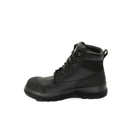 Chaussure de sécurité S3 Premium haute à lacets. Tige en cuir gras pleine fleur renforcée au talon et sur l’embout. Col et languette rembourrés et doublés cuir. Semelle caoutchouc Vibram®. Embout fibre de verre et semelle anti-perforation textile.