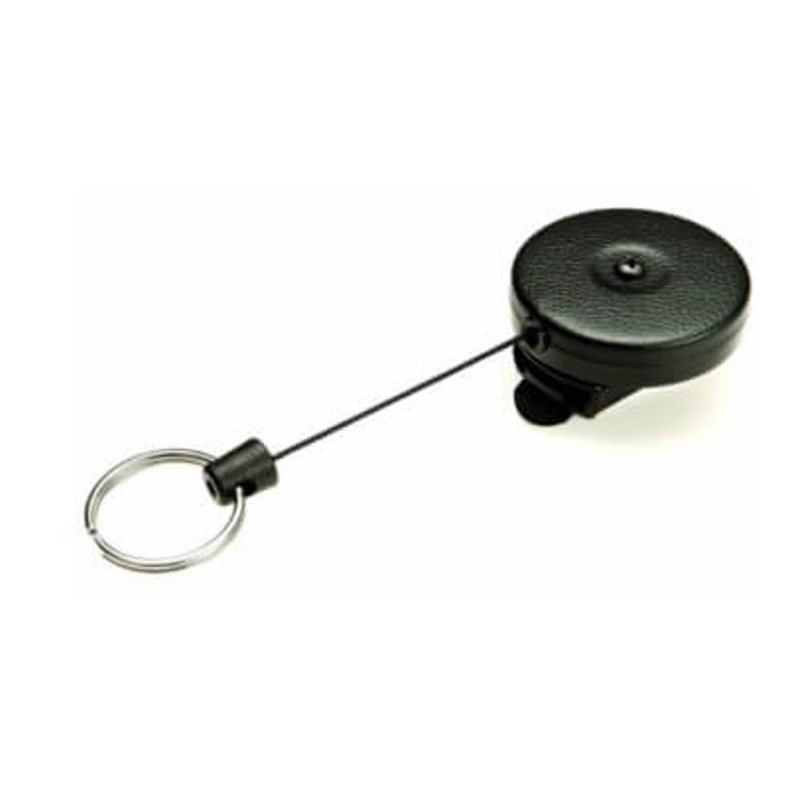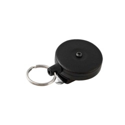 Dérouleur ceinture noir cordon Kevlar · Le Key-bak original a été inventé en 1948 · Couleur Black Vynil · Léger et compact · Cordon Kevlar®: silencieux, solide et ne rouillant pas · Clip ceinture · 15 clés · Avec anneau pour les clefs · Idéal pour les cutters.